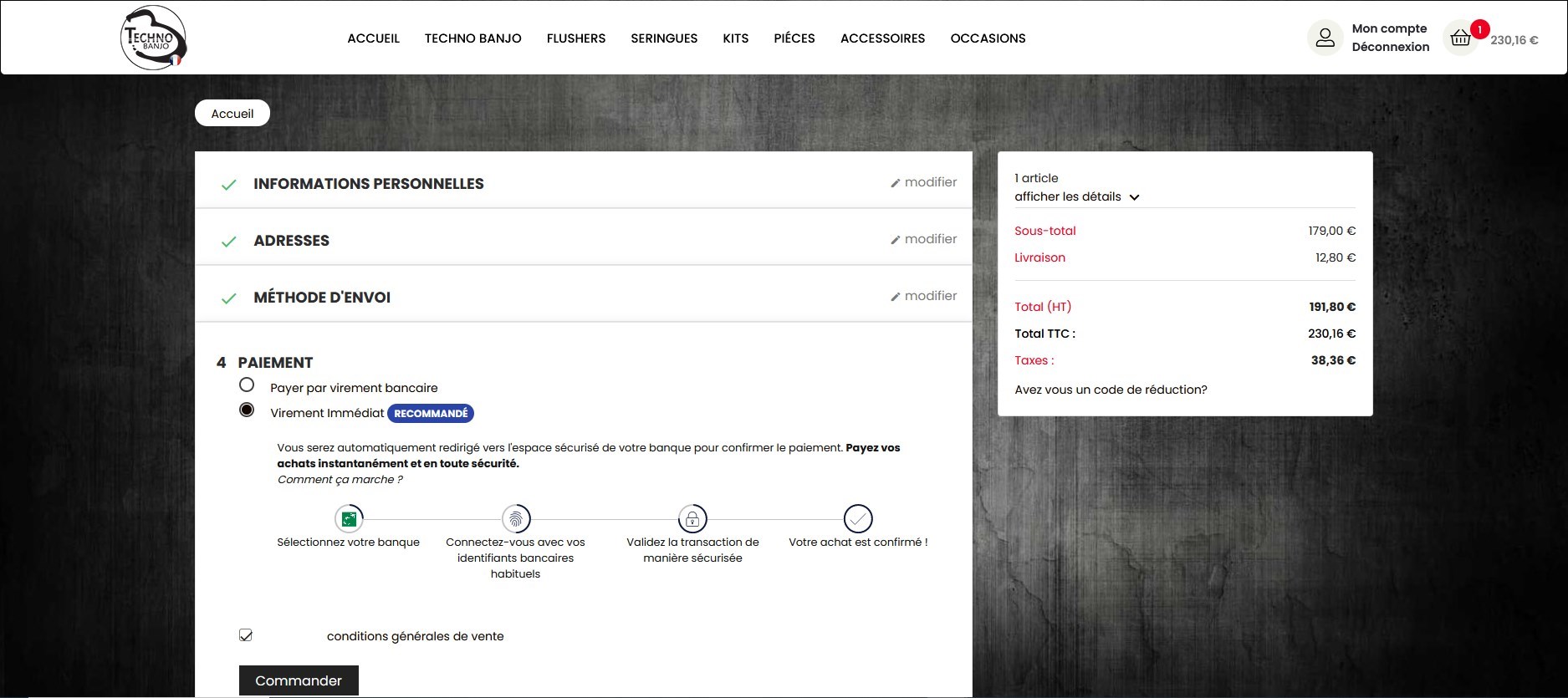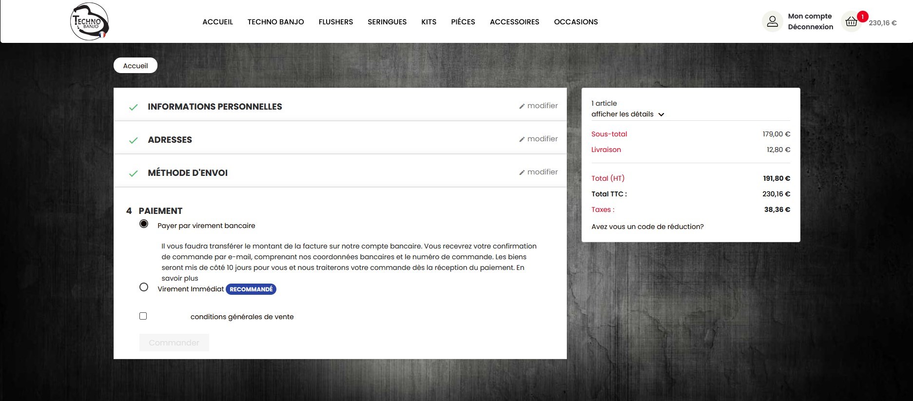 Le mode de paiement par virement est simple, il vous suffit de faire un virement en ligne ou en banque de la totalité du montant de la commande sur le compte dont les coordonnées bancaires vous ont été transmises lors du processus de paiement sur notre site.
